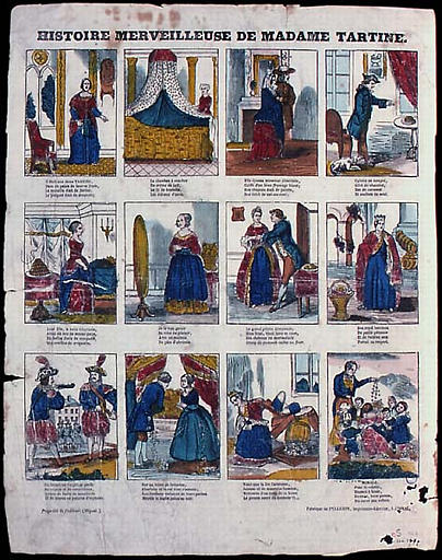 Propriété de l'éditeur. (Déposé.) (b. g.) ; Fabrique de PELLERIN, Imprimeur-Libraire, à EPINAL (b. d.) ; Il était une dame TARINE, / Dans un beau palais de beurre frais [...] Donnez, bons parents, / Du sucre aux enfants. ; MINISTÈRE DE L'INTÉRIEUR / SURETÉ GÉNÉRALE / VOSGES / COLPORTAGE (revers, h. g.)