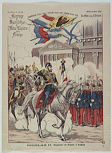 scène historique (équestre passant, cavalier : Nicolas II Alexandrovitch, visite officielle, cheval, soldat : Français, drapeau : France) ; ornementation (drapeau : Russie, drapeau, main)