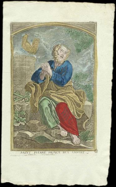 scène (saint Pierre : assis, auréole, clé, coq, livre)