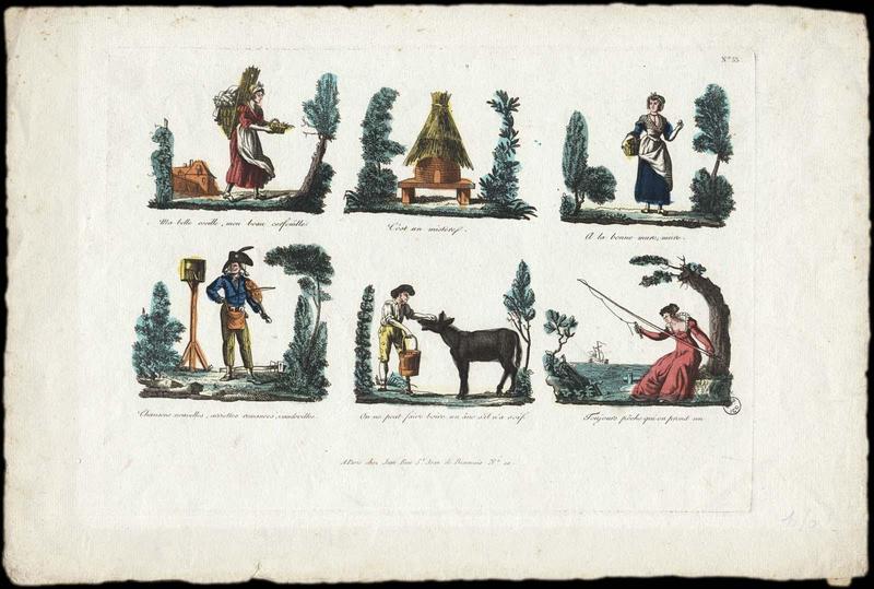 suite de scènes (cycle thématique, femme : commerçant : oseille, hotte, ruche, musicien (violon) ; violon ; âne ; seau ; homme ; femme ; pêcheur ; pêche à la ligne)