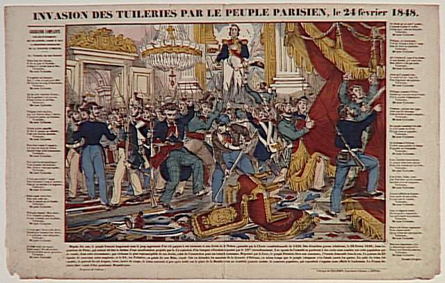 scène historique (destruction : palais : intérieur, trône, rideau, tableau : portrait : Louis-Philippe Ier, soldat, homme, Révolution française de 1848, lustre, fusil : baïonnette)