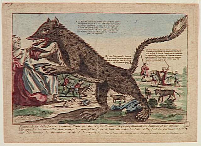 Se Vend à PAris chez Basset rue St Jacques au coin de la rue des Mathurins a Se Ge[illisible] (b. d.) ; Figure de la Bête féroce nommée Hiène qui dévore les Hommes [...] sur les limites du Gévaudan et de l'Auvergne. (b. m.) ; A. Ce Monstre attaqua une femme avec ses trois enfants [...] elle fut récompense par sa Majesté. (h. m.) ; B. Cette bête cruelle dévora le 22 Avril dernier un enfant de 12 a 13 ans près le Village des Pruniers (c. m.) ; Ce monstre le 12 Janvier dernier attaqua 4 ou 5 enfants [...] le Roy leur fit donner une récompense. (c. d.)