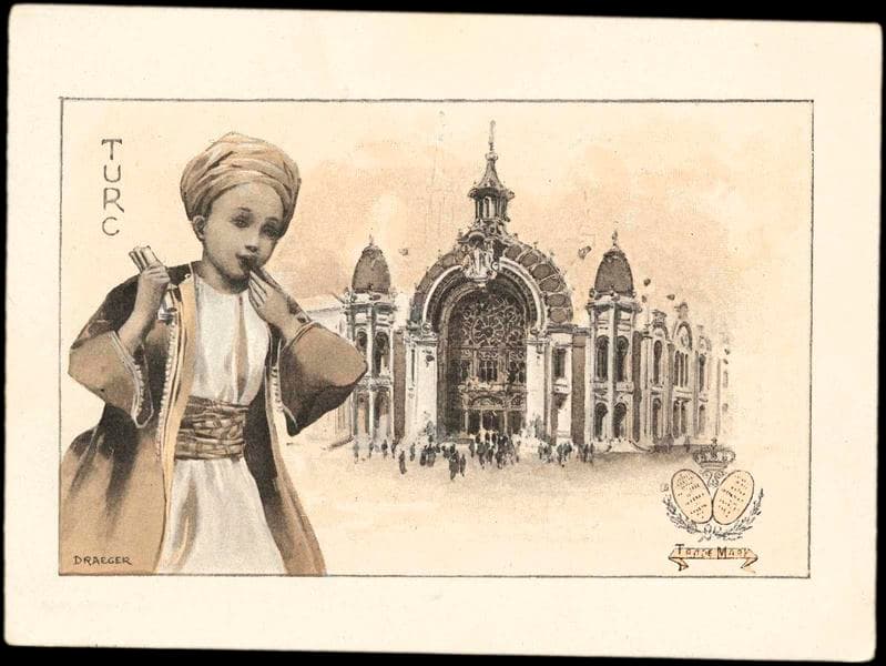 figure (garçon, Turc, costume traditionnel, chocolat) ; vue d'architecture (Paris, palais d'exposition : Turquie, exposition universelle) ; ornementation (guirlande : feuille, guirlande : fleur, couronne) ; revers (ornementation, guirlande : feuille, guirlande : fleur, couronne)
