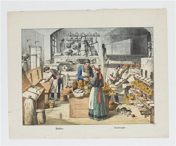 scène (boulangerie, boulanger, pain, pâtisserie, farine, four, femme : costume traditionnel, chat, balance)