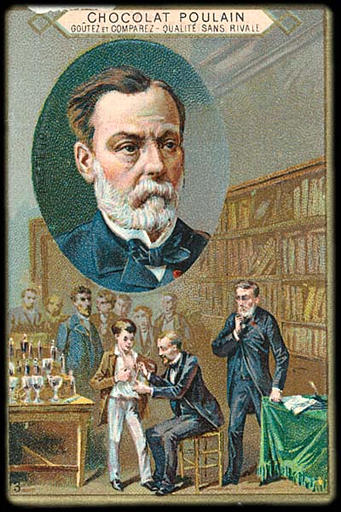 CHOCOLAT POULAIN / GOUTEZ ET COMPAREZ - QUALITE SANS RIVALE (h. m.) ; DIVULGATEURS DE LA SCIENCE ; - 1re Série, / composée de 10 sujets, éditée et mise en relief par la / CHOCOLATERIE POULAIN (revers, b. m.) ; PASTEUR / Louis Pasteur (. . .) à garches, près de Paris (revers) ; Poulain