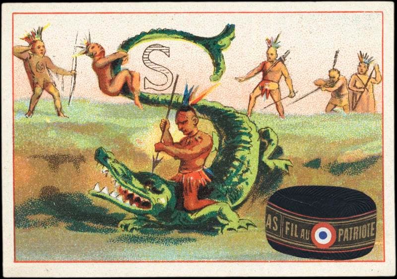 Lettre 'S' formée par un caïman qu'essaient péniblement de maitriser des indiens (titre factice)