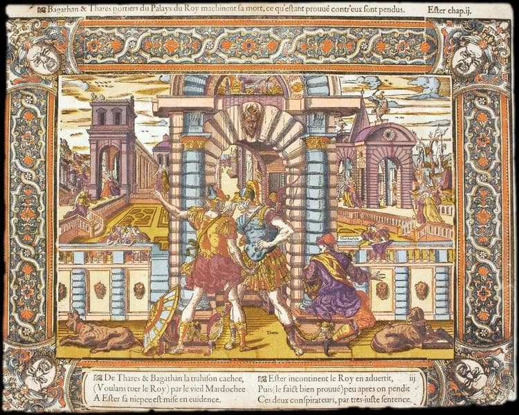 Bagathan & Thares portiers du Palays du Roy machinent sa mort, ce qu'eftant prouvé contr'eux sont pendus. Ester chap. ij (titre inscrit)