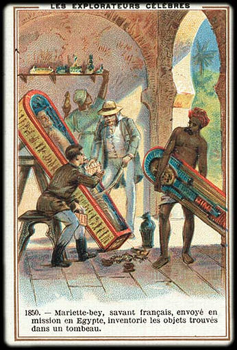 LES EXPLORATEURS CELEBRES / 1850.- Mariette, savant français, envoyé en / mission en Egypte, inventorie les objets trouvés / dans un tombeau (titre inscrit)