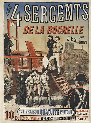affiche publicitaire de la maison Fayard pour le roman de J. Beaujoint sur les Sergents de La Rochelle publié en 1890