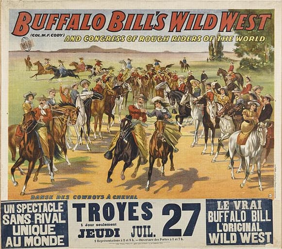 UN SPECTACLE / SANS RIVAL / UNIQUE / AU MONDE (b. g.) ; TROYES / 1 Jour seulement / Jeudi Juil / 27 / 2 représentations à 2 et 8 h. - Ouverture des Portes à 1 et 7h (b. m.) ; LE VRAI / BUFFALO BILL / L'ORIGINAL WILD WEST (b. d.)