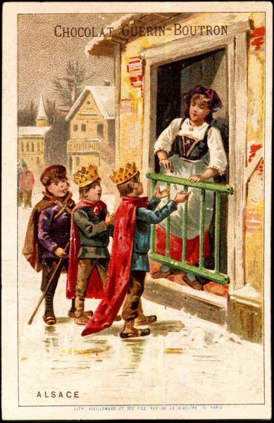 scène (Alsace, hiver, neige, enfant, déguisement : roi, couronne, rue, femme, costume traditionnel, don : monnaie, Epiphanie : ?)