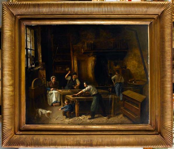scène (atelier, intérieur, menuisier, femme, chaufferette, enfant, chien)
