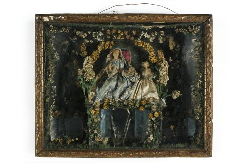 les deux figurines sont dans une boite, au milieu de fleurs de toutes espèces et de guirlandes de végétaux ; une image d'epinal (à moitié effacée) représentant une crucifixion accompagnée d'inscriptions est collée au dos de la boite