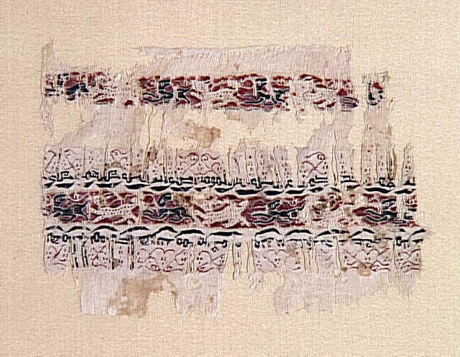 Deux bandes de tapisserie de soie à décor de chiens poursuivant des lièvres (?). L'une des deux bandes a une inscription donnant le nom d'un ministre fatimide.