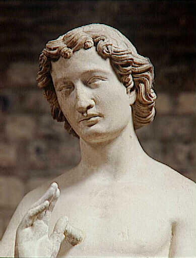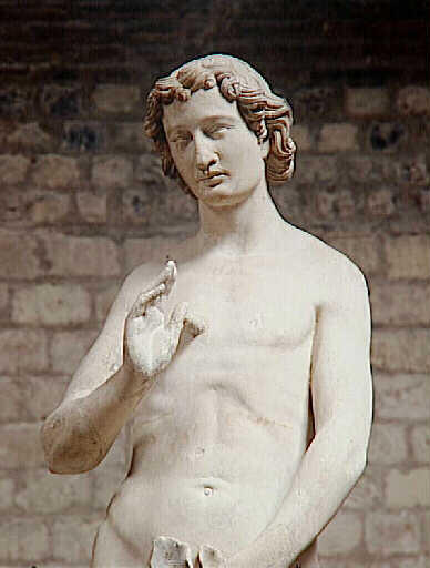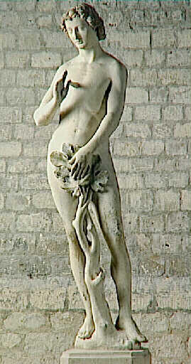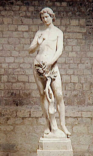 Adam, debout, derrière une tige de figuier dont les feuilles qu'il maintient de la main gauche cachent sa nudité. Le bras droit replié monte sur sa poitrine.; Le bras droit, les deux jambes et les orteils du pied gauche ont été refaits par M. Geoffroy. Il ne reste qu'un fragment de l'avant bras et de la jambe gauche.