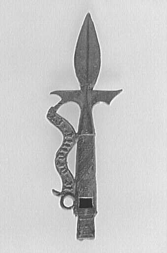 Sifflet adoptant la forme d'une hallebarde et orné de bandes hachurées et d'une banderole sur laquelle figure une inscription