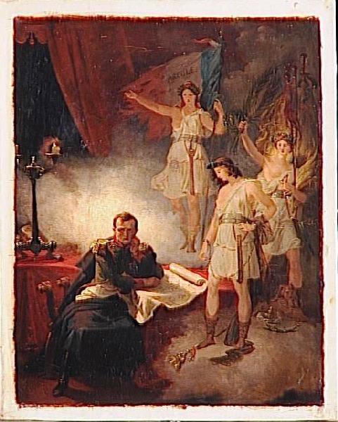annotation, Face : Sur le drapeau : 'ARCOLE.' ; étiquette annotée : De la main de M. Magnin (décollée du revers) : 'Blondel, Merry Joseph, 1781 - 1853 ; élève de Regnault. Napoléon à Ste Hélène, entouré des génies de sa gloire (campagne d'Italie, expédition d'Egypte)/ Hôtel Drouot, 22 Février 1934. Vente par autorité de justice de l'atelier de Blondel, demeuré en la possession de Melle Wittersheim, fille de l'ancien directeur des Journaux officiels (lequel avait perdu toute sa fortune dans le krach de l'union générale)'