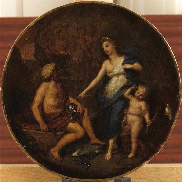 Au premier plan, une femme habillée à l'antique et portant une cape bleue, accompagnée de l'Amour tenant un arc, s'adresse à un homme assis qui tient d'une main un casque et de l'autre un marteau. A ses pieds reposent un bouclier et des instruments de travail. A l'arrière-plan, trois hommes travaillent autour d'une enclume sur laquelle rougeoient des braises.