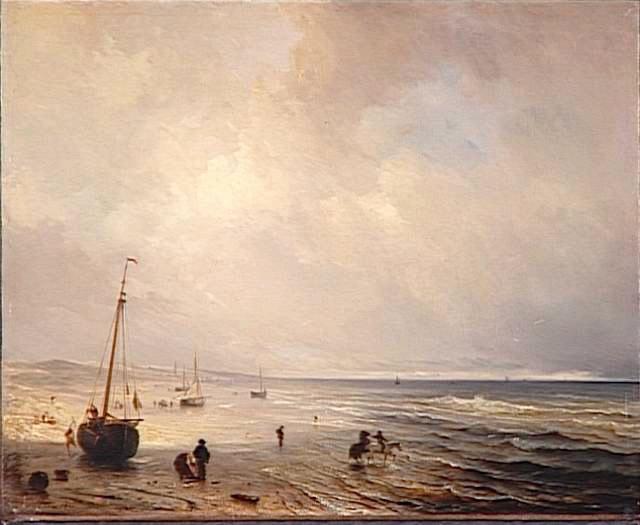 Sur la plage à marée basse, un bateau à voiles; d'autres voiliers sont dans la mer un peu plus loin. Quelques personnages et un cavalier sur le rivage animent la composition.