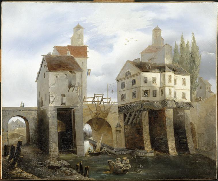 étiquette annotée, revers, de la main de M. Magnin : Leprince Robert-Léopold 1800-1847/ Le pont de Moret