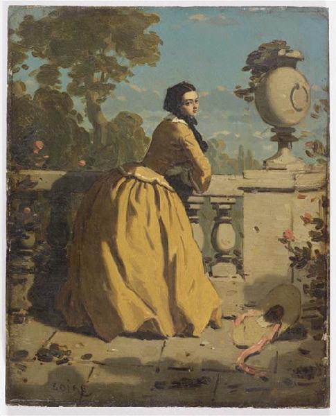 figure (femme, en pied, accoudé, balustrade, robe, mode : époque Second Empire, chapeau) ; fond de paysage