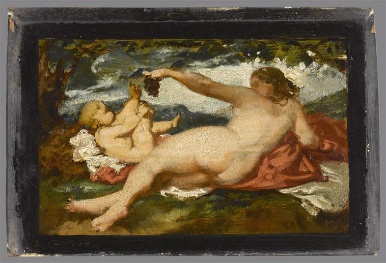 monogramme, en bas à droite, à la pointe : HL ; datation, en bas à gauche, à la pointe, dans la bordure noire : 12 ms [mars ?] 64 ; annotation, au revers du carton (caché par le montage), au crayon noir : Henri Lehmann 1864, signé de son monogramme à la pointe à droite ; notice de catalogue de vente, au revers du montage, collée en haut à droite (en partie déchirée) : 7. LEHMANN (Henri)/ Femme nue et enfant/ Esquisse sur panneau/ Signée ; annotée par M. Magnin : Vente du 25 ... Hôtel Drouot, Expert...