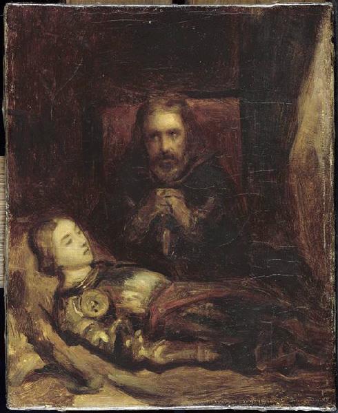 étiquette s annotées, au revers : Ebauche, par Ary Scheffer, de son tableau : Eberhard, comte de Wirtemberg, dit Le Larmoyeur, et ... et tandis que nous, dans notre camp, célébrons notre victoire, que fait notre vieux comte... seul, dans sa tente, devant le corps mort de son fils il pleure (Ballade de Schiller)/ La toile principale est au Louvre/ 1 m 51 x 1 m 62 ; étiquette imprimée, au revers : provenant de la collection de feu M. Rouzet-Huet, vice président de la société artistique du Nord ; annotée par M. Magnin : Le Larmoyeur par Ary Scheffer