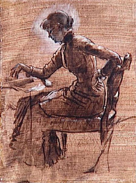 Ces deux études sont réalisées en quelques coups de pinceau de peinture noire, rehaussés de touches blanches et jaunes sur un fond préparé en brun. Le recto est préparatoire à la figure de Kathleen Newton jouant aux échecs dans 'La Chambre donnant sur le port', tableau exécuté vers 1876-1878 (Londres, collection particulière - Matyjaszkiewicz, op cit., n° 71 repr.). Kathleen Newton fut l'amie et le principal modèle de l'artiste pendant de nombreuses années. Le verso est une étude pour l'homme qui apparaît à droite dans 'Le Pont de Richmond', de 1878 (autrefois dans une collection particulière à Londres, passé en vente chez la galerie Stair Sainty - Matyjaszkiewicz, op. cit., n° 99 repr.).