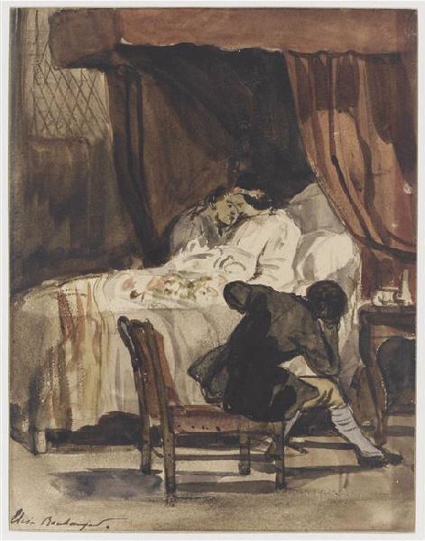 le dessin daterait de la période de son premier mariage. Ce dessin, ainsi que le 1938 DF 83, sont aquarellés dans une facture libre, proche d'une aquarelle d'Hippolyte Poterlet, 'Jésus ressuscitant la fille de Jaïre' (ancienne collection Eugène Delacroix et Alfred Robaut). O. Voisin (d'après reproduction) confirme l'attribution et date ce dessin de la fin des années 1820 (communication orale, 12 octobre 2012).