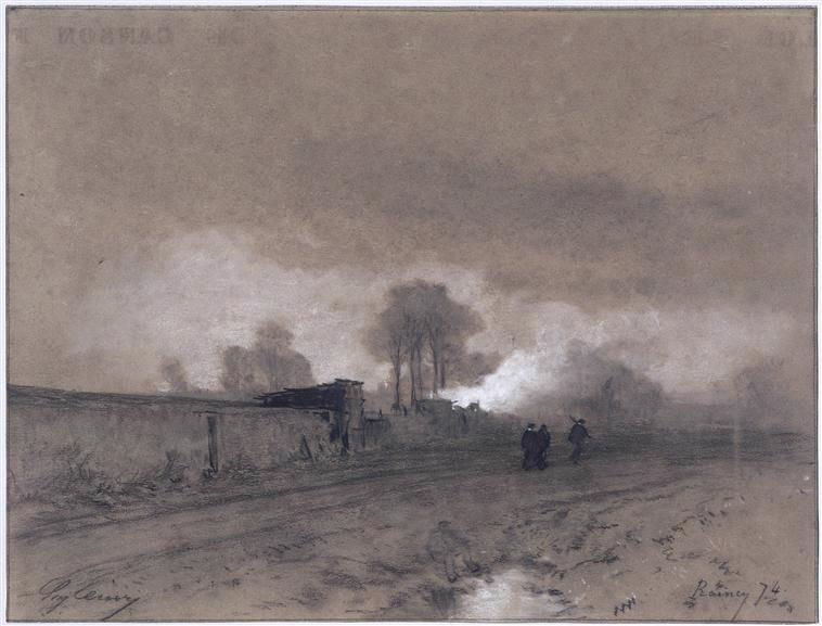 signature, en bas à gauche, à la pierre noire : Eug Ciceri ; datation, localisation, en bas à droite de la main de l'artiste, à la pierre noire : Raincy 74