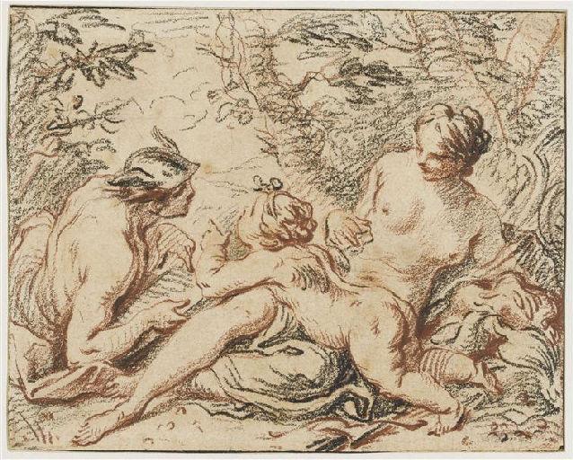 annotation au verso, à la plume et encre brune, de la main de l'artiste (?) : 'Dumont' ; notice de catalogue sur le cadre au revers : (décollée du revers) : 'DUMONT LE ROMAIN (Jean)/ 69. Mars, Vénus et l'Amour/ pierre noire et sanguine/ H. 10 cm ; L. 12 cm' annotée par M. Magnin, à la plume et encre brune : 'Vente du 21 mars 1932, expert Jean Cailac' (M. Magnin a barré 'Mars' et a inscrit en dessous 'Mercure')