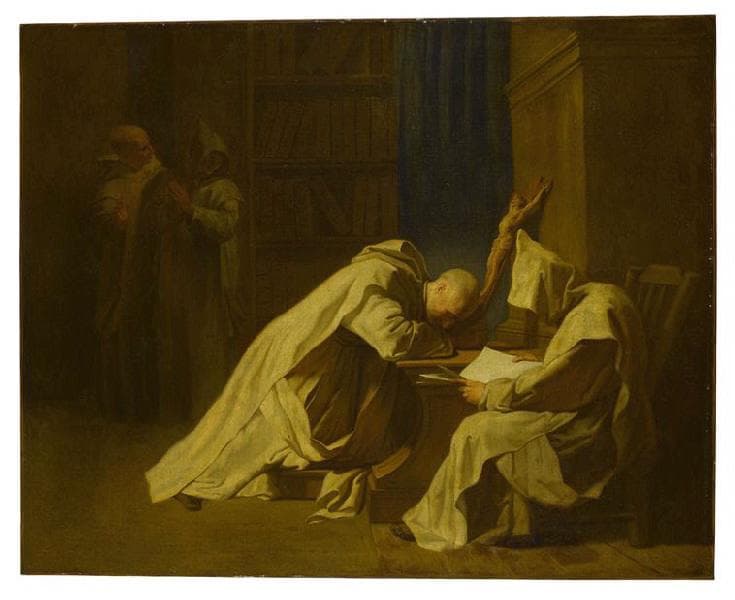 A. Schnapper a regroupé, dès 1974, les différentes répliques ou copies faites d'après un Saint Bruno priant à genoux de Jouvenet dont la version du Nationalmuseum de Stockholm est retenue comme l'original. Celle du musée Magnin, différente par son format en longueur et sa composition, peut être considérée comme une oeuvre d'atelier de belle qualité. On sait que les élèves de l'atelier de Jouvenet s'exerçaient en copiant les peintures du maître. Récemment, C. Beauvalot-Gouzi, auteur d'une thèse de doctorat sur Restout (1997), a proposé de voir dans la présente version une oeuvre du jeune Restout, la première connue, alors en apprentissage chez son oncle Jouvenet. Cette proposition repose sur l'existence d'une esquisse à l'huile sur papier représentant un moine capuchonné ; elle est signée au revers : 'Restout' et annotée de la même main : 'en May 1711/ en une heure et/ demy' (New York, Metropolitan Museum of Art, inv. 1982-25-1). Cette figure correspond à celle qui est ajoutée à droite dans la version du musée Magnin, où on retrouve une façon similaire de traiter les ombres