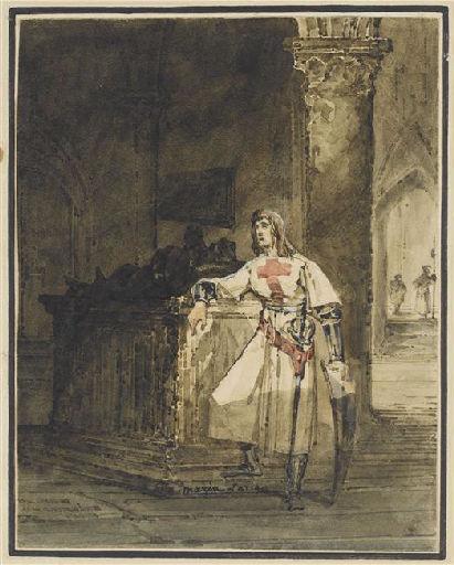 scène (homme, costume : croisade, départ, intérieur, église, tombeau, colonne)