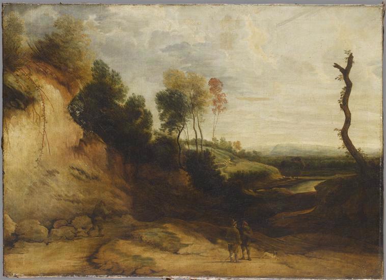 paysage (personnage, chien, rocher, arbre)