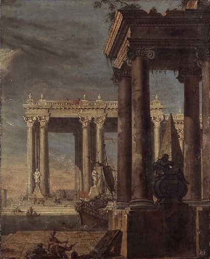 vue d'architecture (palais, colonne, statue, port, mer, bateau, personnage)