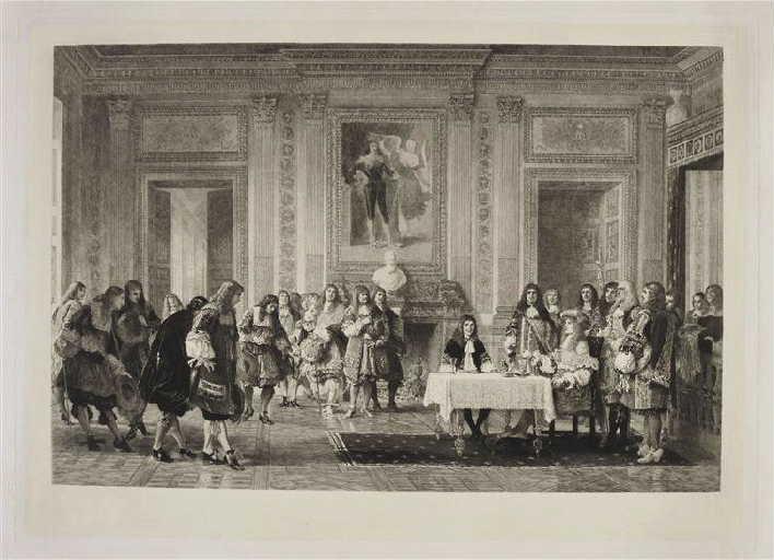 scène historique (Louis XIV, Molière, visite, repas, table, tapis, tableau, cheminée)