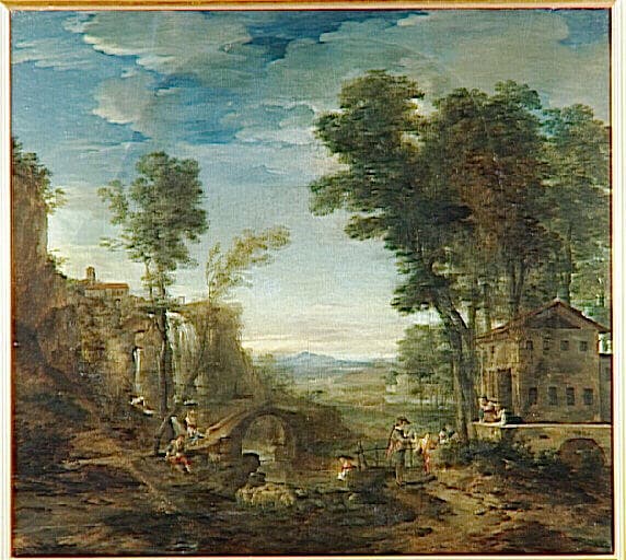 Paysage (où l'on voit un pont, une chute d'eau, un berger qui garde des moutons et chèvres, un joueur de musette vêtu de bleu, sur la gauche une femme)