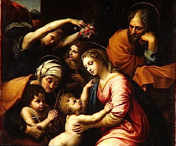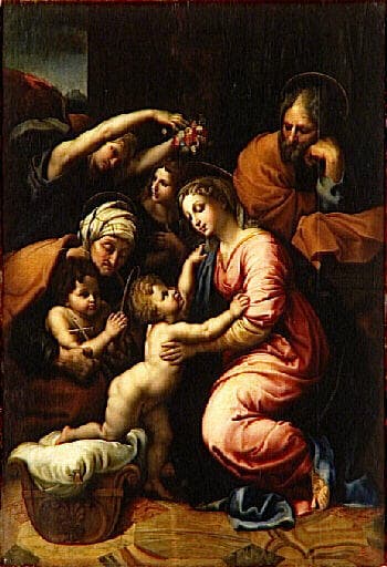 Père Pierre DAN, 'Le Trésor des Merveilles de la Maison Royale de Fontainebleau', Paris, 1642. Réédité en 1990. (p.61) ; 'The Diary of John Evelyn', éd. A. Dobson, Londres, 1906, 3 vol. Réed. en 1955 ? (II, p.120) ; Abbé GUILBERT, Description historique des château, bourg et forest de Fontainebleau, contenant une Explication Historique des Peintures, Tableaux, Reliefs, Statües, ornemens qui s'y voyent ; et la vie des Architectes, Peintres & Sculpteurs qui y ont travaillé, 2 tomes, Paris, 1731 (I, p.155 - II, p.74) ; Le guide du voyageur à Fontainebleau, Fontainebleau, 1820 (p.24) ; E. Jamin 'Fontainebleau ou notice historique et descriptive sur cette résidence royale'. Paris, 1834 et 1836 (p.150) ; Notice 1841 (p.56, n°262) ; Louis Dimier, 'Copies exécutées sous Henri IV des originaux de la collection de François Ier', L'Oeuvre d'art, 1900. ; Louis Dimier, 'Copies peintes par Michelin et Josse de Voltigeant', dans 'Critique et controverse touchant différents points de l'histoire des arts', Paris, 1909, p.47 à 55. ; Henri L. Brugmans, 'Châteaux et jardins de l'Ile de France d'après un journal de voyage de 1655' (par Louis Huygens), Gazette des Beaux-Arts, 1937, tome XVIII (p. 106) ; L. Dussler, 'Raphaël. A critical catalogue of his pictures, wall paintings and tapestries', Londres et New-York, 1971 (p.48) ; Janet Cox-Rearick, 'La Collection de François Ier', Les dossiers du département des peintures n°5, Musée du Louvre, Paris, 1972 (n° 36, p.31 et 32) ; Sylvie Béguin, Notices du catalogue de l'exposition : 'Raphaël dans les collections françaises', Grand Palais, 1983-1984 (n°10, p. 93 à 95) ; D. Cordellier, dans 'Raphaël et l'art français', Exposition, Paris, 1984 (n°228, p.179-180) ; Arnaud Bréjon de Lavergnée, 'L'Inventaire de Lebrun de 1683', Notes et Documents des Musées de France, n°17, Paris, RMN, 1987 (n°3, p.86-87.) ; Janet Cox-Rearick, 'Chefs-d'oeuvre de la Renaissance, La Collection de François Ier', Paris, 1995 (p.206-207)