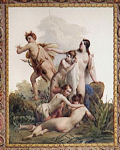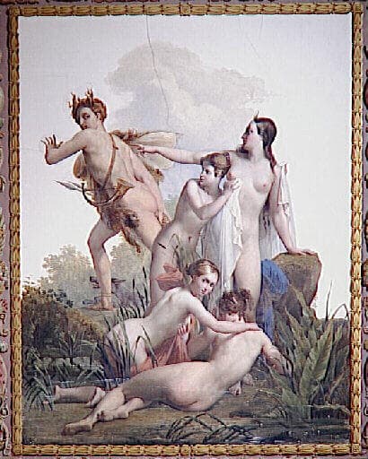 commande de Louis XVIII pour la seconde Galerie de Diane à Fontainebleau ; la voûte est peinte de l'histoire de Diane par Mery Joseph Blondel et Alexandre Abel de Pujol ; les deux artistes exécutèrent quatre travées en alternance entre 1822 et 1825