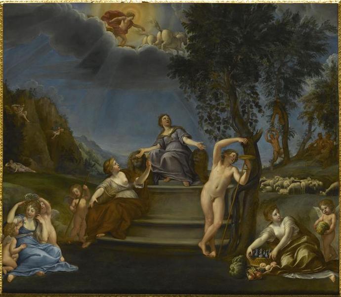 scène mythologique (Cybèle, lion, putti, couronne : fleur, fruit, Bacchus, ?, récipient pour la boisson, vigne, raisin, Pomone, ?, Flore, ?, ) ; fond de paysage (feuillu, montagne, satyre) ; ciel (Apollon, char, effet de soleil, nuée) ; allégorie (printemps, été, automne, hiver) ; allégorie ; terre