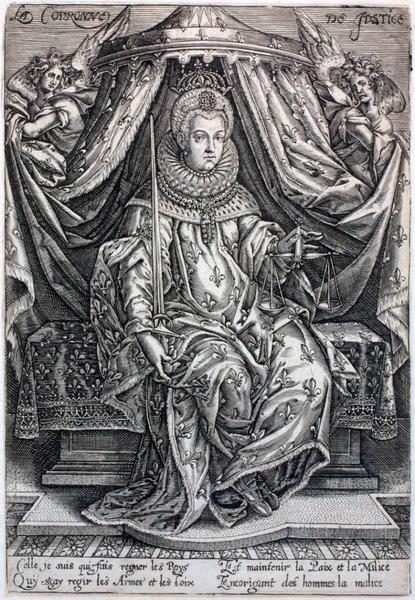 Marie de Médicis en pied, assise, sous un baldaquin, tenant une épée d'une main et une balance de l'autre.