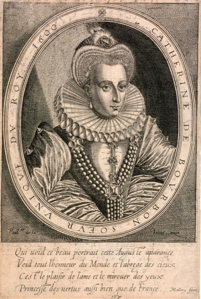 titre, Dans la bordure : CATHERINE DE BOURBON SOEUR UNIQUE DU ROY 1600 ; quatrain, signature, sous le trait carré : Qui void ce beau portrait cette Auguste aparance/ Void tout l'honneur du Monde et l'abrege des cieux/C'est le plaisir de l'ame et le mirouer des yeux/Princesse des vertus aussi bien que de France paules de la Houle d'excu. Mallery fecit