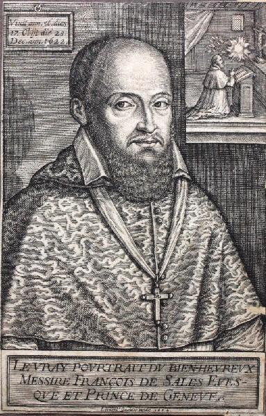 Portrait de St François de Sales, en buste, de 3/4 vers la droite; en haut à droite du portrait : St François prie devant un crucifix et reçoit la lumière divine