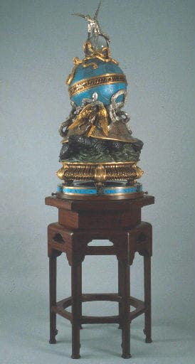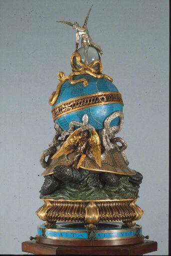 bronze patiné, bronze argenté, bronze doré, émail cloisonné, argent, verre, socle en noyer ; Socle : un disque porte une inscription sur la tranche: 'Tout vient à point à qui sait attendre' en six langues. Au centre du disque (mais invisible au spectateur) : une tête de mort rayonnante entourée des signes du ying et du yang et de l'inscription: 'Wait and win'. Partie centrale : une grande fleur de lotus repose sur 6 grenades ouvertes. Elle contient une eau agitée sur laquelle nage une grosse tortue, qui supporte l'Univers sphérique en équilibre sur sa carapace. L'Univers porte les signes du zodiaque à sa circonférence. Deux serpents enserrent l'Univers de leurs anneaux pour la maintenir; ils rampent vers deux personnages situés de part et d'autre du globe et adossés à la carapace de la tortue : un jeune éphèbe, nu et ailé, a retiré le bandeau qui couvrait ses yeux et a posé ses armes au sol. Il représente l'Amour. Sur l'autre face une jeune femme, qui a revêtu une peau de lion, rampe sur la voûte céleste. Elle représente l'Ambition. Un troisième serpent qui rampe vers l'Amour, maintient une boule de cristal en équilibre instable sur l'Univers. Une jeune femme nue, ailée, est assise sur cette boule. Elle représente la Fortune et soulève le bandeau qui recouvre ses yeux pour regarder vers le fonds de l'Univers où se trouve la tête de mort rayonnante entourée du yang et du yang. Un support en palissandre, octogonal, sur 6 pieds supporte l'ensemble de l'oeuvre. ; Modèle de couronnement de fontaine en émail cloisonné ayant pour sujet 'La Fortune'. La déesse, assise sur le globe terrestre soulève le bandeau de ses yeux pour mieux discerner ses favoris; à ses pieds, le Temps, représenté par les mois du Zodiaque, s'enfuit. La Patience, principe de tout succès, source de toute fortune, est figurée sous la forme d'une tortue, tandis que les deux mobiles principaux de l'homme, l'Egoïsme et la Sympathie, se montrent sous les traits de l'Ambition et de l'Amour. La devise : Tout vient à point pour qui sait attendre, en diverses langues, français, allemand, anglais, russe, hébreu, arabe et latin, se déroule autour de la base. Exécuté en bronze argenté et en émaux cloisonnés. Le sujet, mobile sur pivot, est placé sur un socle à six pans en noyer ciré ajouré dans le bas et reposant sur six pieds. Le sujet, mobile sur pivot, est placé sur un socle à six pans en noyer ciré ajouré dans le bas et reposant sur six pieds.