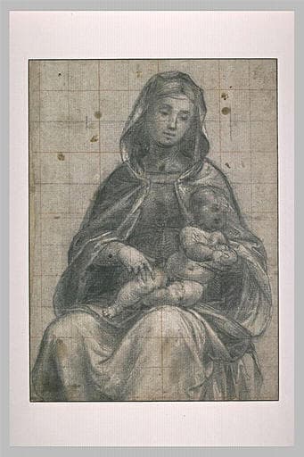 B. Berenson a rapproché cette feuille de la Madonna del Santuario, Vierge à l'enfant trônant avec saint Etienne et saint Jean-Baptiste, que Fra Bartolommeo exécuta pour le Duomo de Lucques en 1509 (The Drawings of the Florentine Painters, Chicago, 1938, II, n° 468). Il s'agit là de la première des Saintes conversations peintes par Fra Bartolomeo. La Galleria degli Uffizi en conserve une (inv. n. 1242 E) et le Museum Boymans - Van Beuningen, de Rotterdam, une esquisse pour la main droite de la Vierge (vol. N 8 recto). Voir à ce propos : cat. exp. Ch. Fischer, Fra Bartolommeo et son atelier, Paris, Musée du Louvre, 1994-1995, n° 52