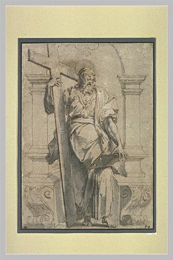 Un apôtre tenant une croix et un livre ouvert, dans une niche