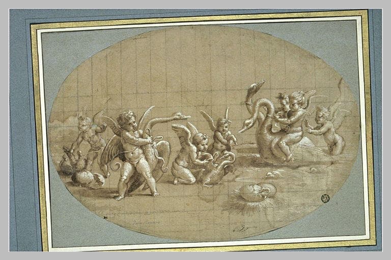 Inventorié en 1671 par E. Jabach comme Raphaël, catalogué par Morel d'Arleux (Inv. ms) sous le nom de Giulio Romano, puis par F. Reiset (Inv. ms) sous celui de Perino del Vaga, ce dessin est un modello, probablement par Giulio Romano, pour une composition peinte, peut-être avec la collaboration de Giovanni da Udine, à la voûte de la travée sud-ouest de la loggia sur le jardin de la Villa Madame, à Rome (1520-1523). Le Cabinet des Dessins conserve un pendant, Amours jouant à la balle (INV 615), étude pour un autre ovale de la même voûte de la Loggia - R. Bacou, in cat. exp. Autour de Raphaël, Paris, Musée du Louvre, 1983-1984, n° 18 ; D. Cordellier et B. Py, Musée du Louvre. Inventaire général des Dessins Italiens, V : Raphaël..., Paris, 1992, n° 977.