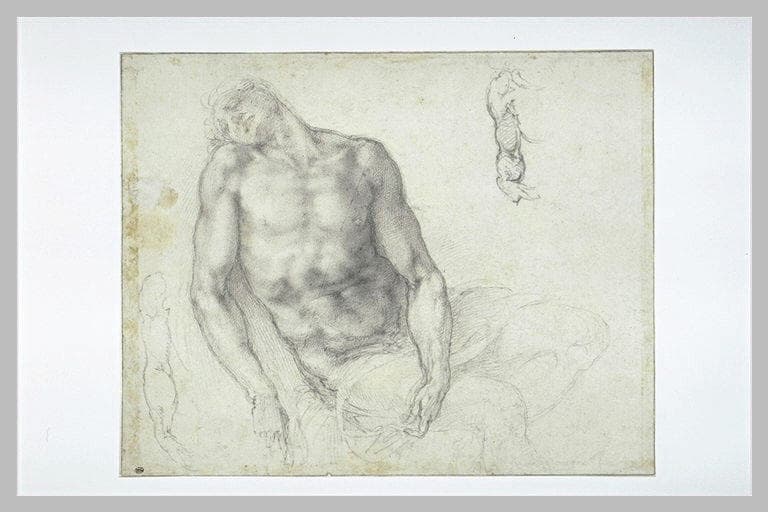 K. Justi fut le premier à relier cette étude au petit tableau d'autel de Sebastiano del Piombo montrant le Christ mort et la Vierge qui tient les instruments de la Passion (Ubeda, Andalousie, église de san Salvadore). La Pietà fut peinte entre 1533 et 1539 sur commande de don Ferrante Gonzague pour la chapelle funéraire de Francisco de los Combos, secrétaire de Charles Quint à San Salvador d'Ubeda. La relation manifeste entre le dessin et le tableau incita E. Panofsky et L. Dussler à donner cette étude au vénitien. La correspondance échangée par les deux artistes au début des années 1530 montre clairement que Michel-Ange envoya des dessins à son ami Sebastiano. La pose du Christ pour laquelle la Casa Buonarroti de Florence possède une deuxième étude (INV 69 F recto) précédant celle du Louvre, dérive d'un antique, le Cupidon endormi, que Michel-Ange avait déjà copié sur une feuille de Windsor (INV 12763). Le dessin de la Casa Buonarroti porte au verso des études pour le Jugement dernier de la chapelle Sixtine, qui ont incité M. Hirst à dater les deux feuilles du séjour romain de Michel-Ange à partir de l'automne 1533, époque où il pouvait discuter en personne le projet du retable avec Sebastiano, lequel dut lui rendre ce dessin, puisqu'il fut acquis par le peintre Jean-Baptiste Wicar de la famille Buonarroti à la fin du XVIIIe siècle. (R. Bonnefoit, dans cat. exp. Partis pris : Jean Starobinski, Largesse, Paris, Musée du Louvre, 1994, n° 94)