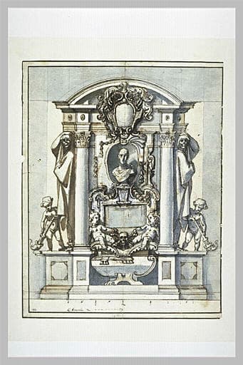 Rapproché des projets pour les apparats funèbres de Ferdinand I de Medici, grand-duc de Toscane (mort en 1609) ou de Philippe d'Espagne par A. Forlani (Mostra del Cigoli e del suo ambiente, San Miniato, 1959, p.142) qui le met en rapport avec d'autres dessins similaires à Florence (Galleria degli Uffizi, n. 2655A, 2615A, 2587A, 164orn.). F. Viatte (Musée du Louvre, Cabinet des Dessins - Inventaire général des dessins italiens - III. Dessins toscans XVIe-XVIIIe siècles, tome I, 1560-1640, Paris, 1988, n° 165) le rattache uniquement à celui pour Ferdinand I de Medici, dont la cérémonie commémorative eut lieu à S. Giovanni dei Fiorentini (Rome), et les projets étaient gravés par Antonio Tempesta (Bartsch, XVII, p. 157). Elle suggère que la feuille du Louvre ait pu être prévue pour le catafalque. M. L. Chappell refuse cette dernière affirmation et met en rapport les études avec le verso du dessin n. 8951F de Florence (Galleria degli Uffizi) avec notre dessin (Disegni di Ludovico Cigoli, Florence, Gabinetto Disegni e Stampe degli Uffizi, 1992, p. 9, 174).