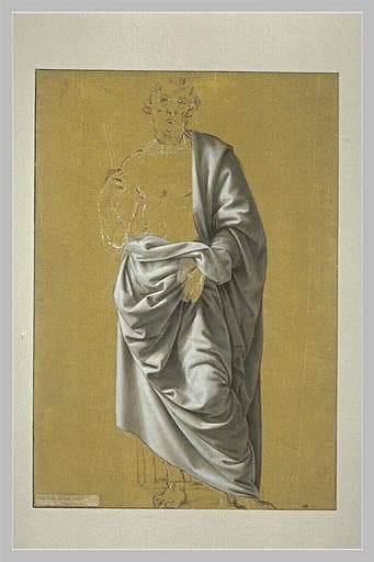 Etude préparatoire pour la draperie du Saint Barthélemy peint par Lorenzo di Credi, probablement vers 1490-1495, sûrement avant 1510, dans l'église d'Orsanmichele, à Florence, sur un panneau encastré dans un pilier près de l'autel à droite (voir G. Vasari, Le Vite de più eccellenti Pittori, Scultori ed Architettori, éd. Milanesi, Florence, 1906, IV, p. 567). Selon G. Dalli Regoli, la distribution et la structure des draperies renvoient plutôt au Jeune saint en gloire de S. Marino, Pasadena (Huntington Art Gallery, voir in G. Dalli Regoli, Lorenzo di Credi, Pise, 1966, n° 41, repr. fig. 50). A rapprocher d'autres études de draperie conservées à Chantilly (Musée Condé, n° 34(28), voir in cat. exp. Dessins italiens du Musée Condé à Chantilly, I : Autour de Pérugin, Filippino Lippi et Michel-Ange, Chantilly, Musée Condé, 1995-1996, n° 26), Rennes (Musée des Beaux-Arts, n° 794.1.2507, voir in B. Berenson in Rivista d'Arte, XXIV, 1932, p. 260, repr. fig. 9 ; Idem, The Drawings of the Florentine Painters, Chicago 1938, n° 2764 A) et Turin (Palazzo Reale, voir B. Berenson, in Rivista d'Arte..., cit., p. 257, repr. fig. 8 ; Idem, The Drawings ..., cit., n° 2764 D*). Cf. les draperies de Léonard et notamment un dessin à Florence, Galleria degli Uffizi, 433E - F. Viatte, cat. exp. Léonard de Vinci. Draperies, Paris, Musée du Louvre, 1989-1990, n° 23, cf. n° 15.